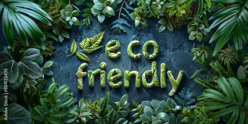 © ds17, Fototapeta premium An eco friendly sign made of green foliage surrounded by lush plants.