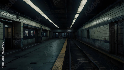 Obraz premium An eerie, deserted subway station platform with fluorescent lights...