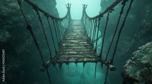 Naklejka premium An eerie, underwater rope bridge stretches between moss-covered rocks, a...