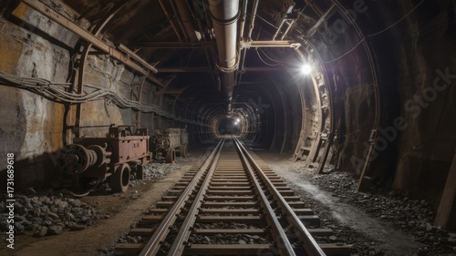 Naklejka premium An eerie view of an abandoned mine shaft with rail tracks leading into the darkness, evoking a sense of history, mystery, and industrial decay