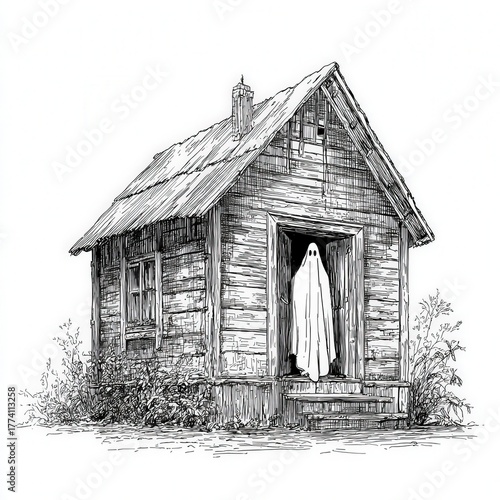 © Shelley, Obraz premium An eerie wooden house with a ghostly figure at the door, capturing a vintage Halloween spirit. Perfect for haunted themes and spooky designs, bringing a touch of the paranormal.