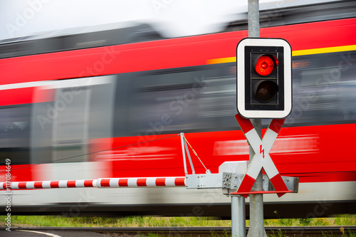 © Rainer Fuhrmann, Obraz premium An einem Bahnübergang zeigt die Ampel rot und ein Zug fährt vorbei