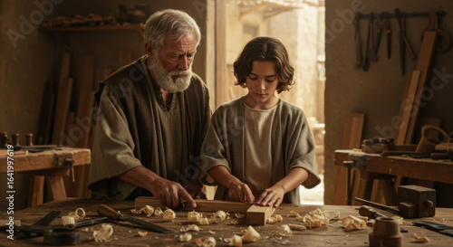 © Светлана Воротняк, Fototapeta premium An elderly carpenter teaches a boy the craft of woodworking in a workshop. Biblical scene of Joseph teaching young Jesus.