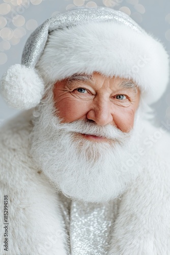 © TrubiAnna, Obraz premium An elderly Caucasian man with a white beard and blue eyes wears a silver Santa Claus hat and a fluffy white coat. The background is frosty and festive, evoking Christmas spirit.