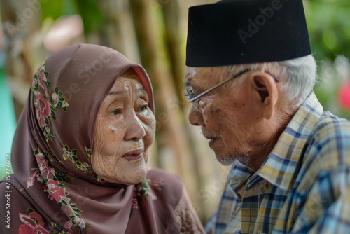 © grey, Fototapeta premium An elderly Malay couple looking at each other