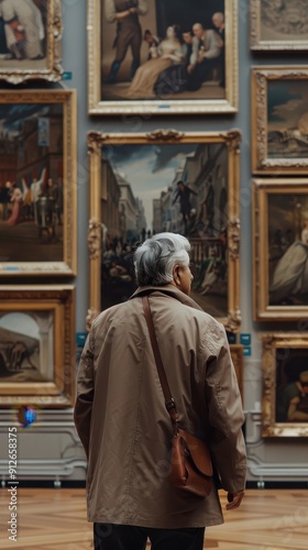 Fototapeta premium An elderly man admires various classic paintings in a vibrant art gallery