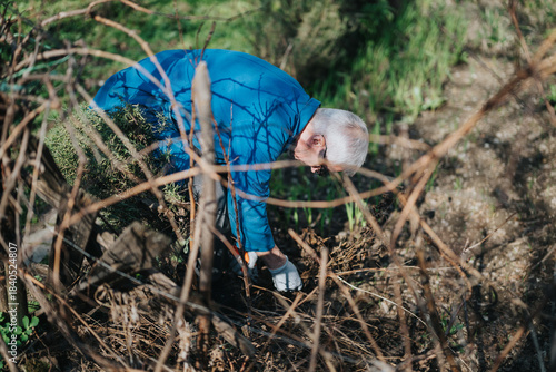 Naklejka premium An elderly man in a bright blue jacket bends to clear brush and branches in a garden, focused on outdoor maintenance and yard work.