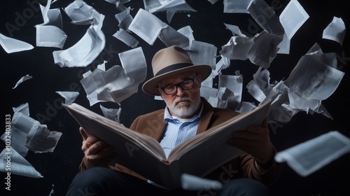 © fotofabrika, Obraz premium An elderly man in a hat immersed in a book as pages swirl around him in a dark, dramatic setting