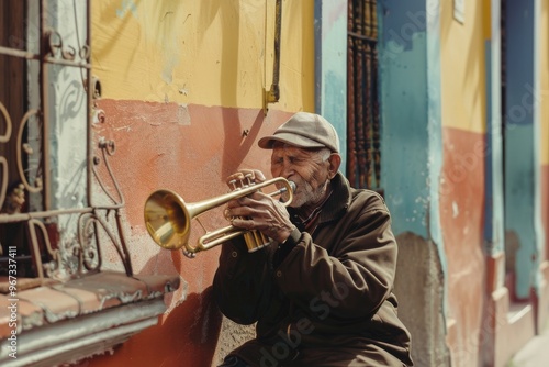 © Victor Bertrand, Obraz premium An elderly man plays the trumpet, seated against a vibrant, painted wall in a nostalgic street, depicting the art and soul of old neighborhoods.