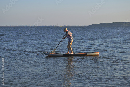 © Viktor, Naklejka premium An elderly man pours on SUP while standing.
