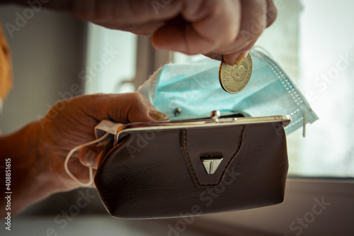 Obraz premium an elderly man puts a coin in his wallet. wallet and mask in hands. coin with...