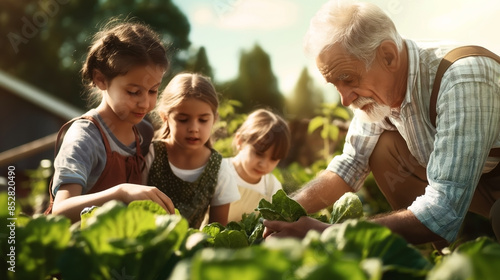 © OMD, Obraz premium An elderly man teaches three young children how to garden. They are all focused on a row of green leafy plants under sunlight.