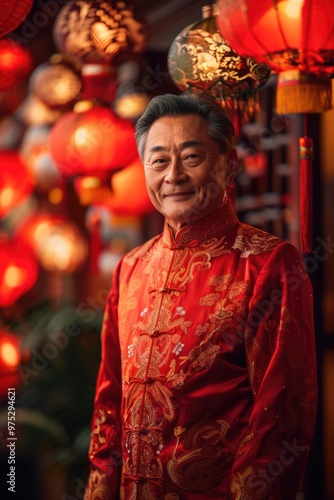 © fanjianhua, Fototapeta premium An elderly man wearing traditional Chinese clothing stands under a lantern