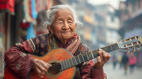 © THINNAKORN, Fototapeta premium an elderly woman playing the guitar, smiling brightly in a well-lit room