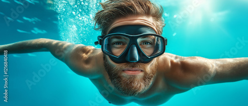 © Дмитрий Петров, Naklejka premium An elderly woman snorkeling over a coral reef