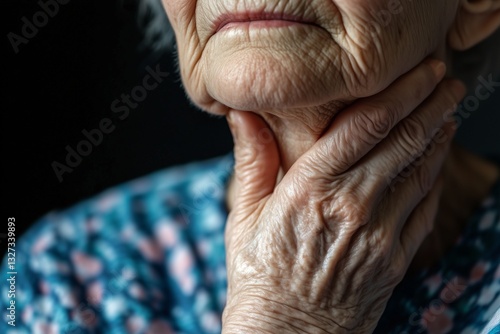© Pacharee, Fototapeta premium An elderly woman touching her neck with discomfort.