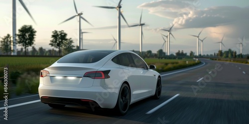 Fototapeta premium An electric car is seen on a picturesque highway with wind turbines in the backdrop, promoting sustainable transportation and renewable energy sources. The scene highlights ecofriendly practices