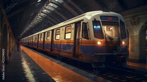 Fototapeta premium An electric powered metro train entering a modern underground subway station...