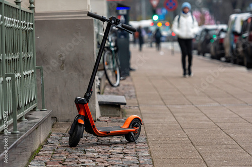 © ako-photography, Obraz premium An electric scooter parked on the sidewalk in Riga, Latvia