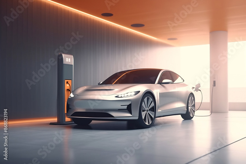 © Canvas Alchemy, Fototapeta premium An electric vehicle or EV car at a charging station with the power cable supply plugged. Eco-friendly sustainable energy concept