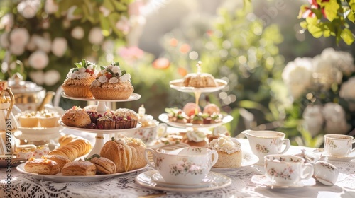 Naklejka premium An elegant afternoon tea setup with a tiered tray of assorted pastries and scones