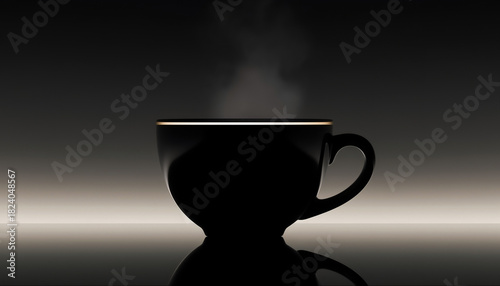 Fototapeta premium An elegant and dramatic low-key silhouette studio shot of a sleek black coffee cup with fine steam gently rising from the hot liquid, resting on a dark, reflective surface. The cup features a thin gol