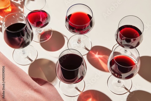 Fototapeta premium An elegant and modern still life of red wine glasses, creating a striking visual with their shadows and colors, perfect for wine tasting or celebration themes.