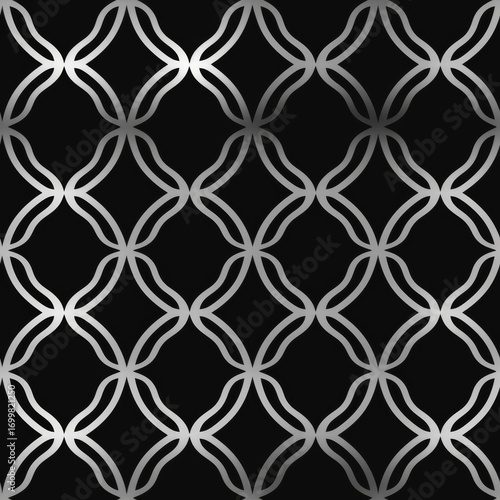 Fototapeta premium An elegant black and silver geometric repeat pattern with interlocking curves forming diamond shapes,