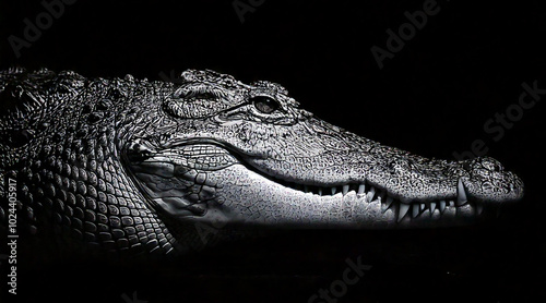 Fototapeta premium An elegant black and white shot of crocodile in a dark setting