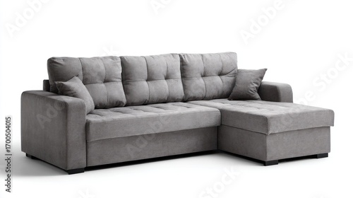 Obraz premium An elegant, comfortable gray sofa with plush cushions against a pristine white background