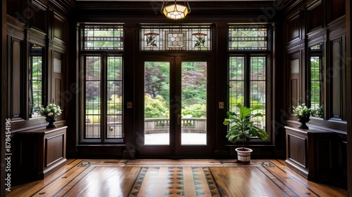 © Dumrongkait, Obraz premium An elegant entryway featuring dark wood paneling, intricate stained glass windows, and a polished hardwood floor. The space is adorned with potted plants and floral arrangements