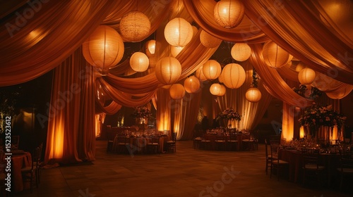 © Shobakh, Obraz premium An elegant event space with paper lanterns and draping fabric