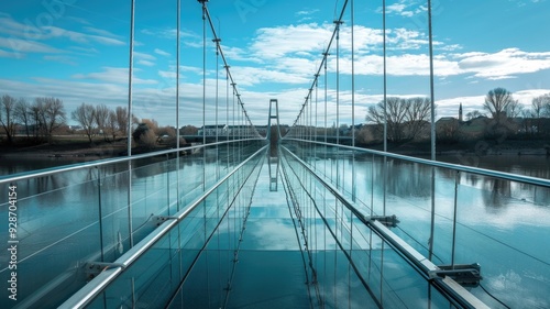 © Anna, Obraz premium An elegant glass bridge spanning across a river, with reflections of the sky and water