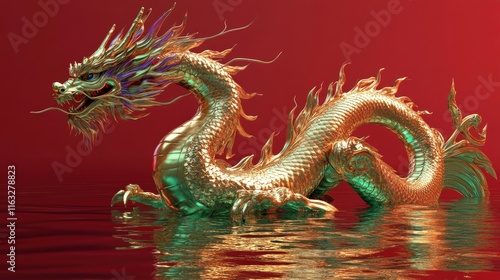 © WITTAYA ANGMUJCHA, Obraz premium An elegant golden dragon with shimmering green and purple details, gently resting on a reflective water surface; the red background enhances its brilliance.
