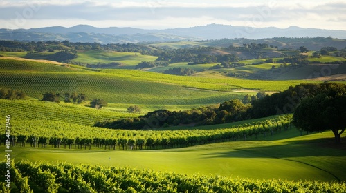 Fototapeta premium An elegant golf course amidst rolling hills and vineyards, Golf clubs ready for a round, Vineyard elegance style