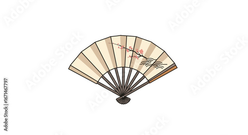 © Muttaqin, Obraz premium An elegant illustration of a traditional Japanese folding fan decorated with a delicate branch of pink cherry blossoms, isolated on a white background