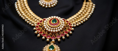 Fototapeta premium An elegant Indian gold necklace adorned with colorful gemstones, creating a breathtaking piece with a beautiful design perfect for any occasion. Copy space image. Place for adding text and design