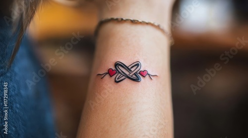 Obraz premium An elegant infinity tattoo is inked on the wrist, featuring two intertwined hearts, symbolizing eternal love and connection, drawn with precise lines and fine details.
