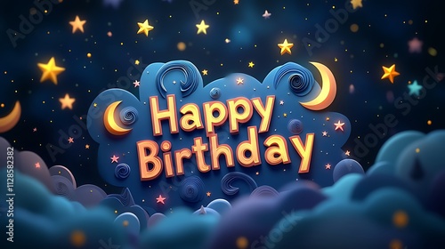 © TranNgoc, Fototapeta premium An elegant kirigami design of "Happy Birthday" with letters encircled by crescent moons, stars, and radiant paper swirls, glowing softly against a nebula-inspired background, hd quality,