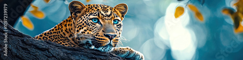 © Lila Patel, Fototapeta premium An elegant leopard in the shade of a tree, blending seamlessly into nature.