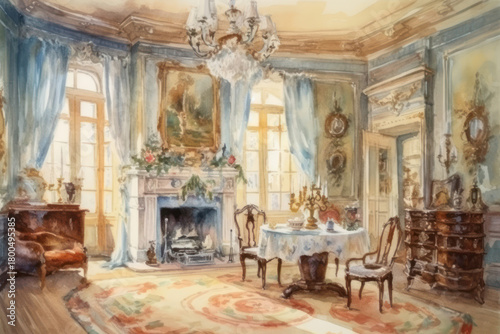 Naklejka premium An elegant living room interior in a classicist style, executed in soft watercolor tones.