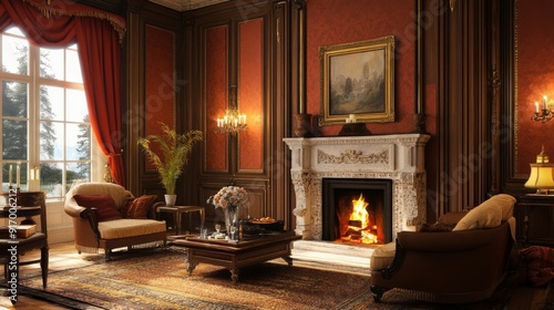 Fototapeta premium An elegant living room with a traditional fireplace, comfortable seating...