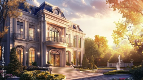 Naklejka premium An elegant mansion featuring intricate architectural details bathed in sunlight