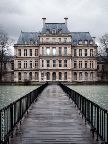 © Katavudh, Fototapeta premium An elegant mansion on a rainy day with a dramatic atmosphere.