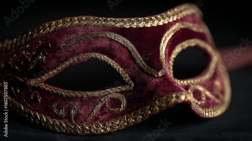 Fototapeta premium An elegant opera mask crafted from deep burgundy velvet with intricate gold-thread embroidery and a delicate wire frame.