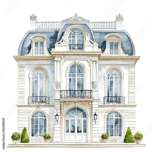 Fototapeta premium An elegant palace facade, classical European architecture, watercolor style, pastel tones, isolated on white background