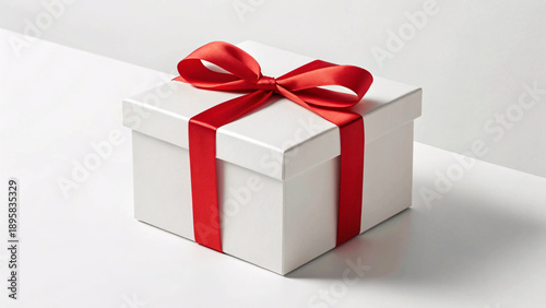 © Wachiraya, Obraz premium An elegant, plain white gift box tied with a classic, bright red satin ribbon and bow, on a white surface.