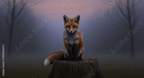 Naklejka premium An elegant red fox sits serenely on a tree stump in a misty forest at dusk
