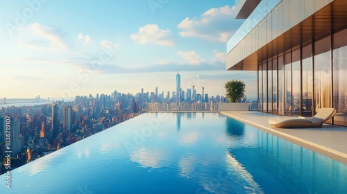 Fototapeta premium An elegant rooftop pool shimmering under the sunlight, overlooking the urban skyline