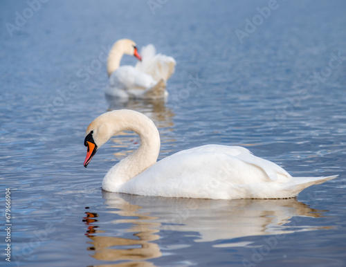 © Macros, Naklejka premium An elegant white swan gracefully arching its neck on the water.